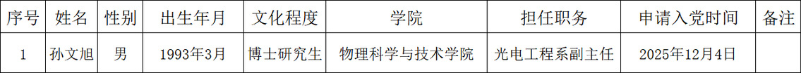 按照《pornHD 发展党员工作实施细则》要求,经光电工程系党支部党员大会推荐、支委会研究决定,并报学院党总支委员会讨论通过,拟确定孙文旭为入党积极分子,为发扬民主,广泛听取党内外群众意见,接受广大党员群众监督,现将孙文旭相关情况予以公示(见附表)。