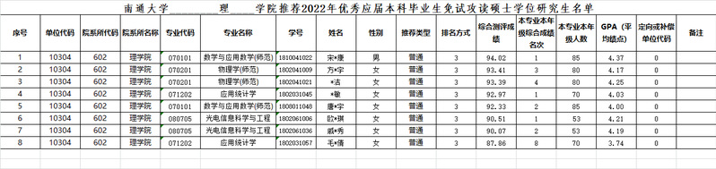 理学院2022年优秀应届毕业生免试攻读硕士学位研究生名单