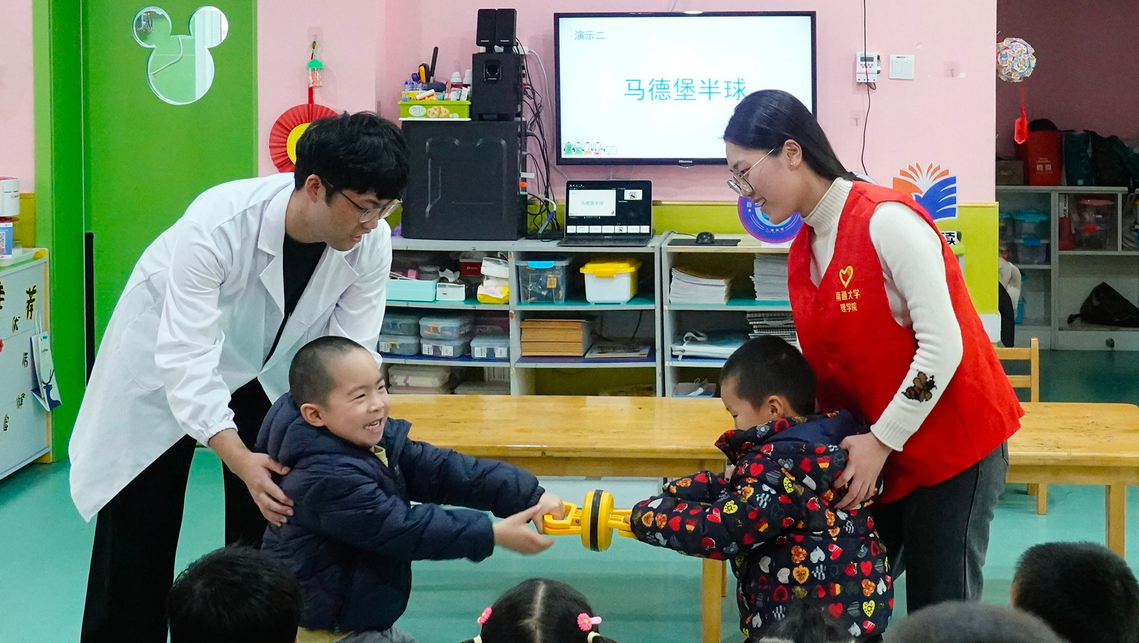 本次活动以“探索物理奥秘,共创绿色未来”为主题。志愿服务团成员李双运、丁轩阳做足功课,向小红花第二幼儿园的小朋友们演示了“看不见的魔力”“马德堡半球”“空气炮”等安全性高、互动性强的物理小实验。在志愿团成员的耐心讲解和指导下,小朋友们亲身体验生活中的物理现象,学习生活中的物理知识。