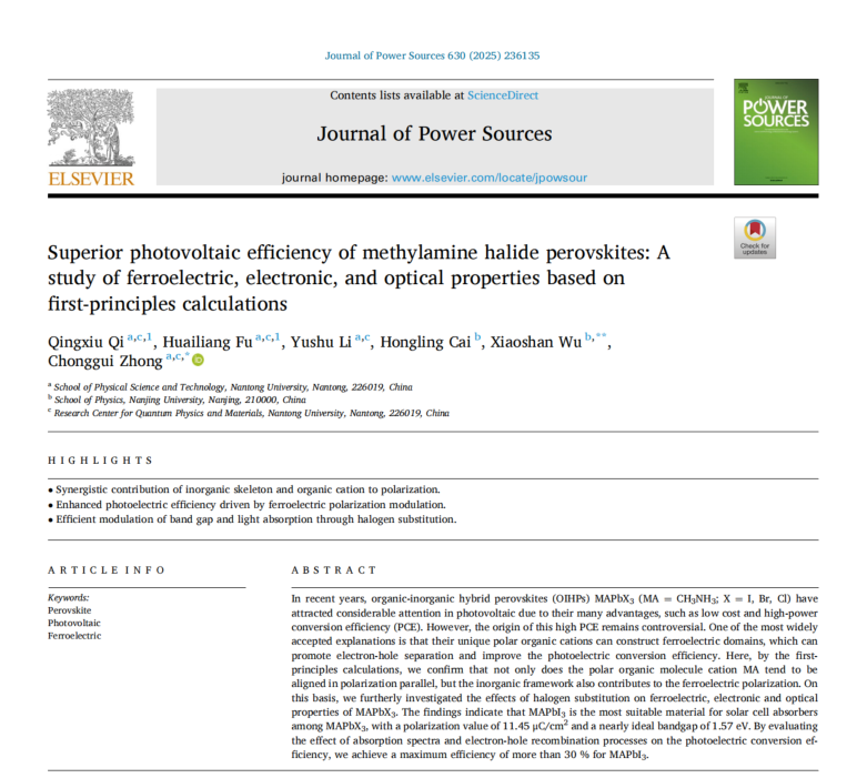 近日,我院仲崇贵教授课题组在MAPbX3(X=I, Br, Cl)钙钛矿太阳能电池的理论研究方面取得新进展。相关研究成果以《Superior photovoltaic efficiency of methylamine halide perovskites: A study of ferroelectric, electronic, and optical properties based on first-principles calculations》为题发表在《Journal of Power Sources》上,南通大学仲崇贵教授和南京大学吴小山教授为共同通讯作者,我院2022级物理学硕士生戚清秀为该论文第一作者,南通大学物理科学与技术学院为第一单位。