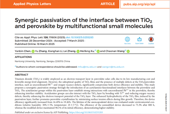 近日,我院许美凤副教授课题组在修饰钙钛矿太阳能电池传输层方面取得新进展。相关成果以《Synergic passivation of the interface between TiO2 and perovskite by multifunctional small molecules》为题发表在《Applied Physics Letters》上,南通大学许美凤副教授和王超男副教授为共同通讯作者,我院23级硕士陈彦斌为该论文第一作者,南通大学为唯一通讯单位。