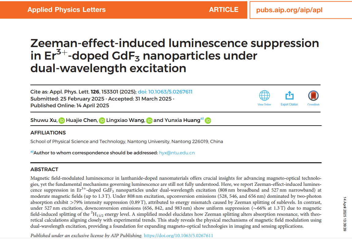 近日,我院徐淑武和黄云霞老师在研究稀土掺杂纳米粒子的荧光发光方面取得进展,相关研究成果以“Zeeman-effect-induced luminescence suppression in Er3+-doped GdF3 nanoparticles under dual-wavelength excitation”为题发表在自然指数期刊《Applied Physics Letters》上,二人共同指导的2022级硕士研究生陈华杰为该论文共同第一作者,论文实验部分以项目合作形式由陈华杰在华东师范大学完成。