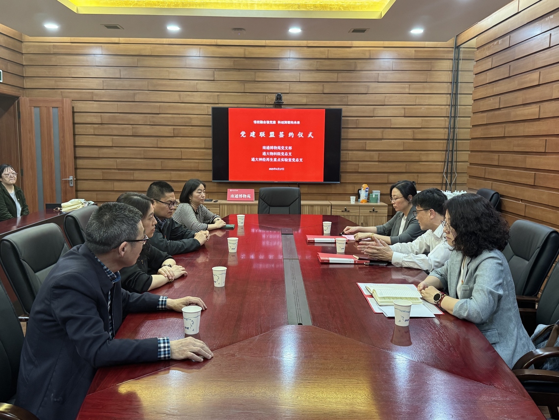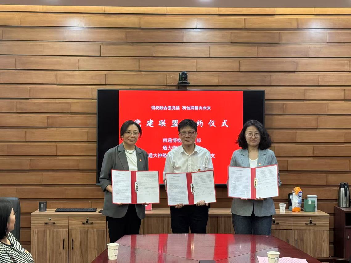 为深入贯彻党的二十大精神,持续深化校地合作,积极践行“名城名校”发展战略。4月17日,物科院党总支与南通博物苑党支部、神经再生重点实验室党总支开展党建三方共建活动。南通博物苑党支部书记严明明、神经再生重点实验室党总支书记龚蕾蕾和物科院党总支书记徐凌共同签署了《三方党建联盟合作共建协议书》。