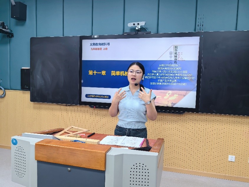崇川初级中学物理组六位经验丰富的骨干教师采用“杠杆”与“滑轮”同课异构的形式开展示范教学。在“杠杆”教学中,教师以“拔图钉”实验导入课堂,通过个性化任务引导学生探究支点位置与施力关系,逐步构建杠杆概念;在“滑轮”教学中,则借助滑轮组模型设计情境,让学生在操作中分析定滑轮与动滑轮的机械特性。六位教师均以“问题链”串联课堂,结合分组实验探究、数据记录与讨论总结,帮助学生从现象观察走向规律提炼,充分体现“做中学”的教学理念。
