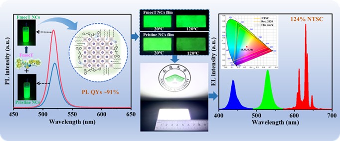 钙钛矿纳米晶体在光电子学领域具有广阔的应用前景,但面临表面缺陷诱导的光致发光效率低和稳定性差等难题。本研究开发了一种基于功能化氨基酸分子(FmocT)的表面工程策略在室温环境制备高质量的铯铅溴纳米晶。FmocT分子通过配位、氢键和阳离子-π相互作用充分钝化纳米晶表面缺陷态,极大增强了荧光量子产率及性能稳定性。同时,通过掺杂聚乙烯吡咯烷酮提高了铯铅溴纳米晶复合发光薄膜的力学性能,并表现出良好的紫外和热稳定性。最后,基于该发光薄膜制备的白光发光器件实现了~124%的NTSC标准色域。这项工作为有效提高钙钛矿纳米晶光学性能及稳定性开辟了新的途径,展示了钙钛矿纳米晶在高性能显示背光源中的应用潜力。