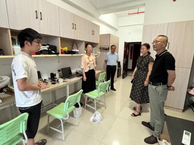 在研究生宿舍区,学院领导在实地查看住宿条件后,叮嘱学生们要注意防暑降温,合理安排作息和饮食,确保身心健康两不误。同时也强调大家要注意宿舍用电安全、增强防范意识、保持卫生整洁,如遇到问题,及时联系导师和辅导员。