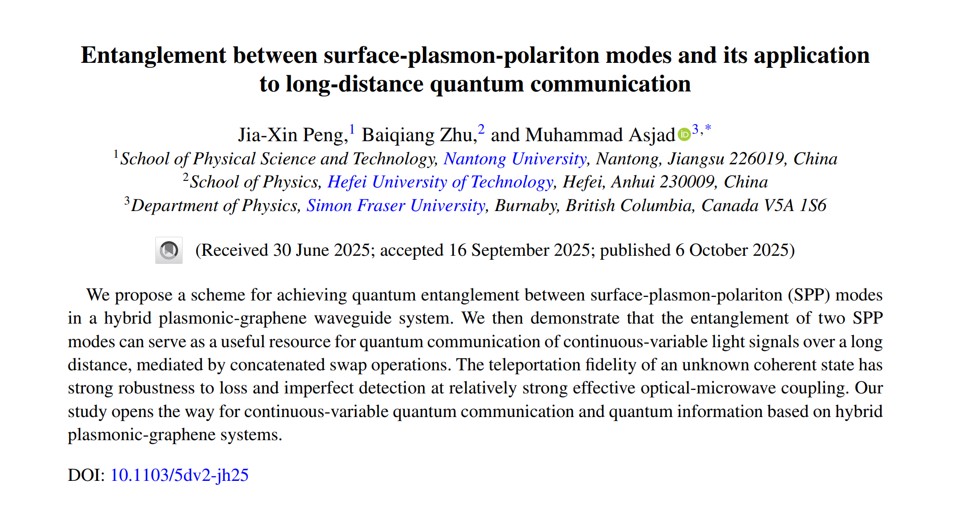 近日,我院彭家鑫博士与合肥工业大学朱百强博士后、加拿大西蒙弗雷泽大学(Simon Fraser University)Muhammad Asjad副教授合作,在量子纠缠与量子通信研究方面取得新进展。相关研究成果以“Entanglement between surface-plasmon-polariton modes and its application to long-distance quantum communication”为题发表在自然指数期刊《Physical Review A》上。南通大学物理科学与技术学院为第一单位。