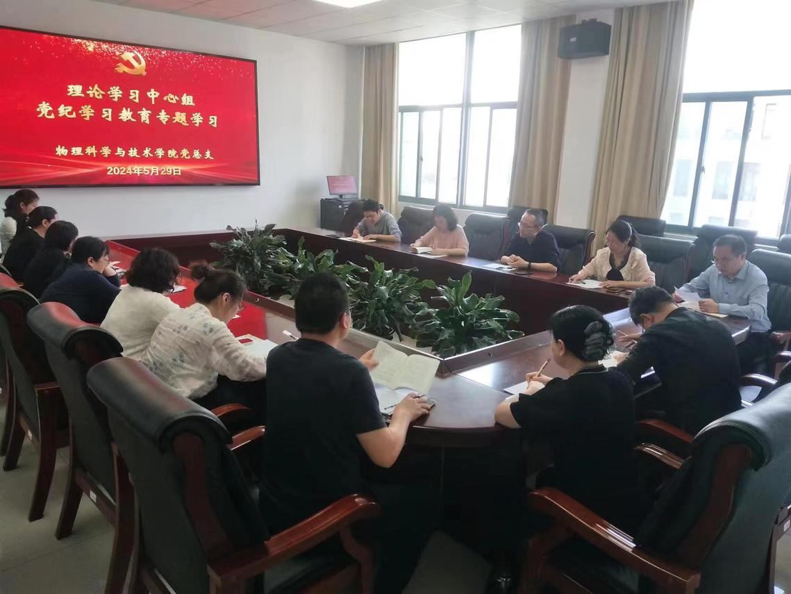 5月29日,物理科学与技术学院举行党纪学习教育专题读书班第四次、第五次、第六次集中学习暨党总支理论学习中心组学习会。学院党总支书记徐凌主持会议并讲话。副院长傅怀梁、于忠卫和光电工程系支部书记刘勇分别作领学。综合办主任杨锋、光电工程系主任黄云霞、物理系支部书记邵旭萍、团委书记陈烨、实验中心支部书记薛同莲、本科生支部书记陈祎妮分别作了交流发言。