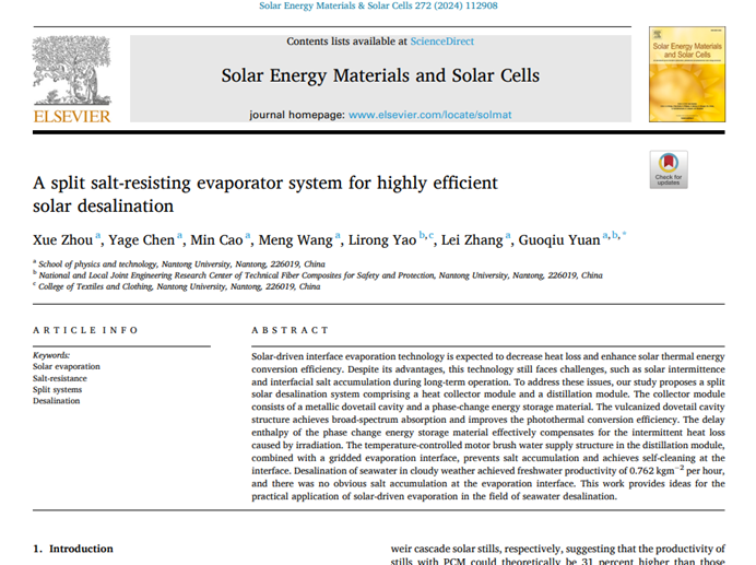 近日,物理科学与技术学院袁国秋、曹敏和王孟课题组在太阳能驱动海水淡化研究方面取得新进展。相关研究成果以《A split salt-resisting evaporator system for highly efficient solar desalination》为题,南通大学为第一单位,发表在期刊《Solar Energy Materials and Solar Cells》(《太阳能材料和太阳能器件》)上。