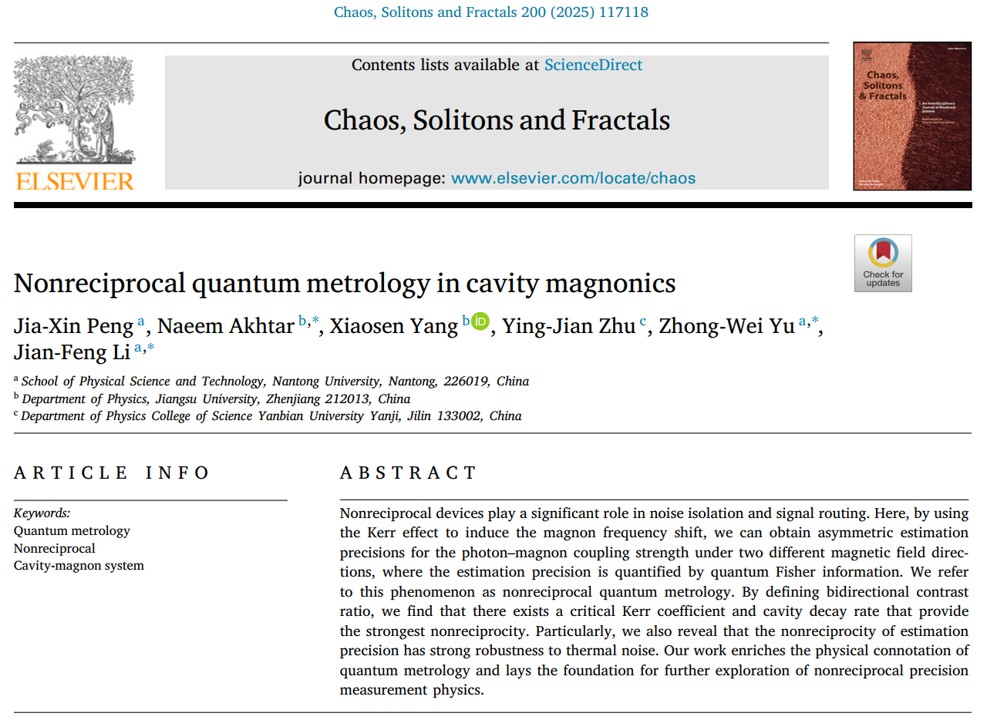 近日,我院彭家鑫博士团队与江苏大学学者合作,在非互易量子精密测量研究方面取得新进展。相关研究成果以“Nonreciprocal quantum metrology in cavity magnonics”为题发表在中科院一区Top期刊《Chaos, Solitons and Fractals》上。南通大学物理科学与技术学院为第一单位。