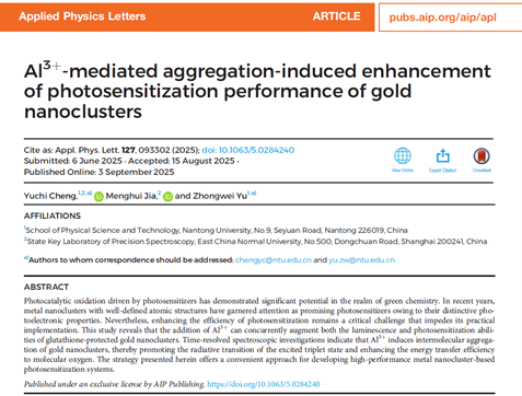 近日,我院程宇驰博士及其合作者在金属纳米团簇光催化性能调控方面取得新进展。相关研究成果以“Al3+-mediated aggregation-induced enhancement of photosensitization performance of gold nanoclusters”为题发表在自然指数期刊《Applied Physics Letters》上。南通大学物理科学与技术学院为第一单位和通讯单位。